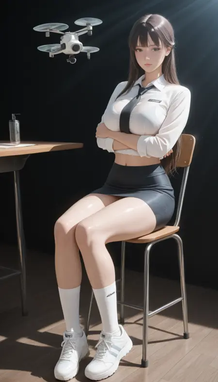 shirt, long sleeves, gloves, navel, jewelry, jacket, earrings, pants, midriff, white gloves, stomach, uniform, crop top, ascot, military, military uniform, piercing, thigh gap, ear piercing, brooch, cropped jacket, epaulettes, white pants, name tag, holster, tight clothes, id card, navel piercing, white ascot, military jacket, tight pants, collared shirt, thigh strap, blue jacket, belt, black belt, handgun, badge, thigh holster, thigh pouch