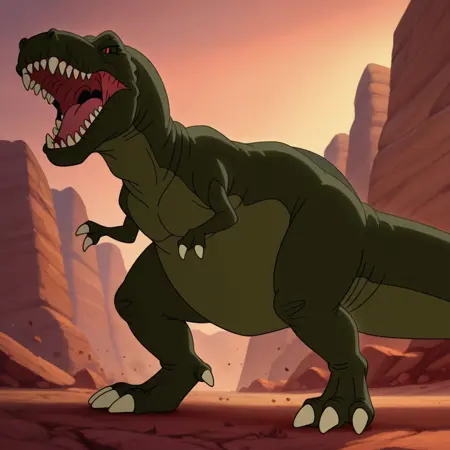 feral, male, Tyrannosaurus rex, dark green skin, red eyes, slit pupils,
