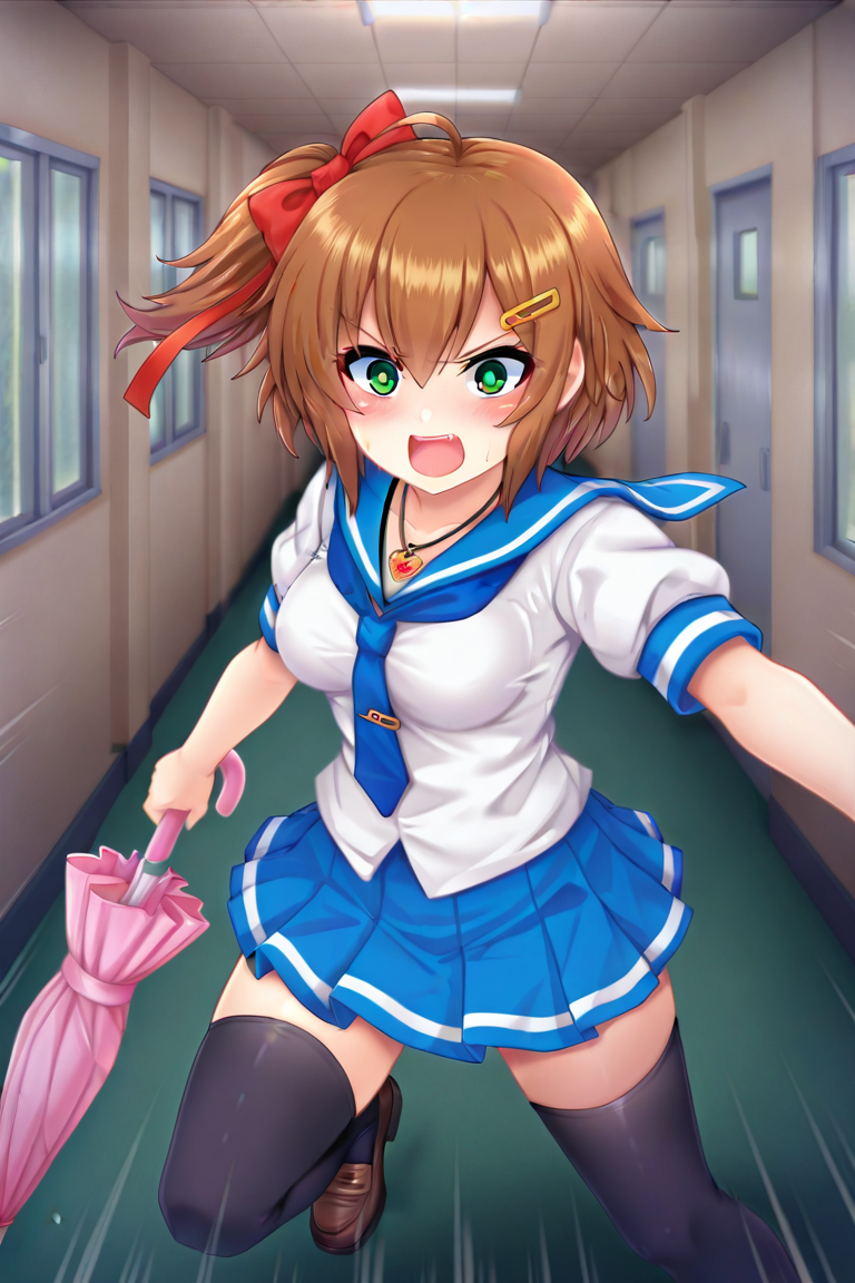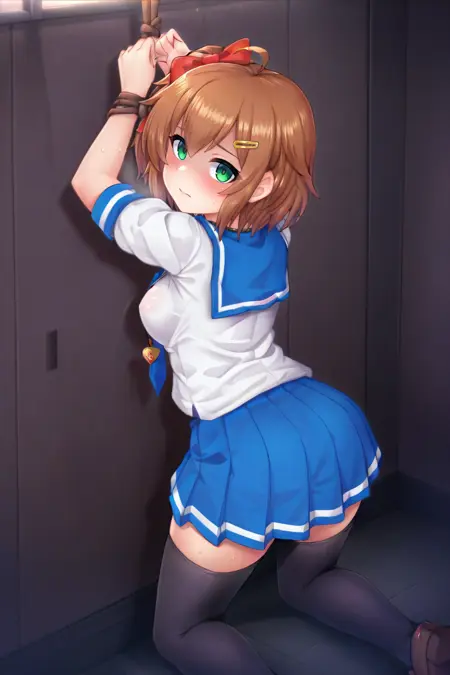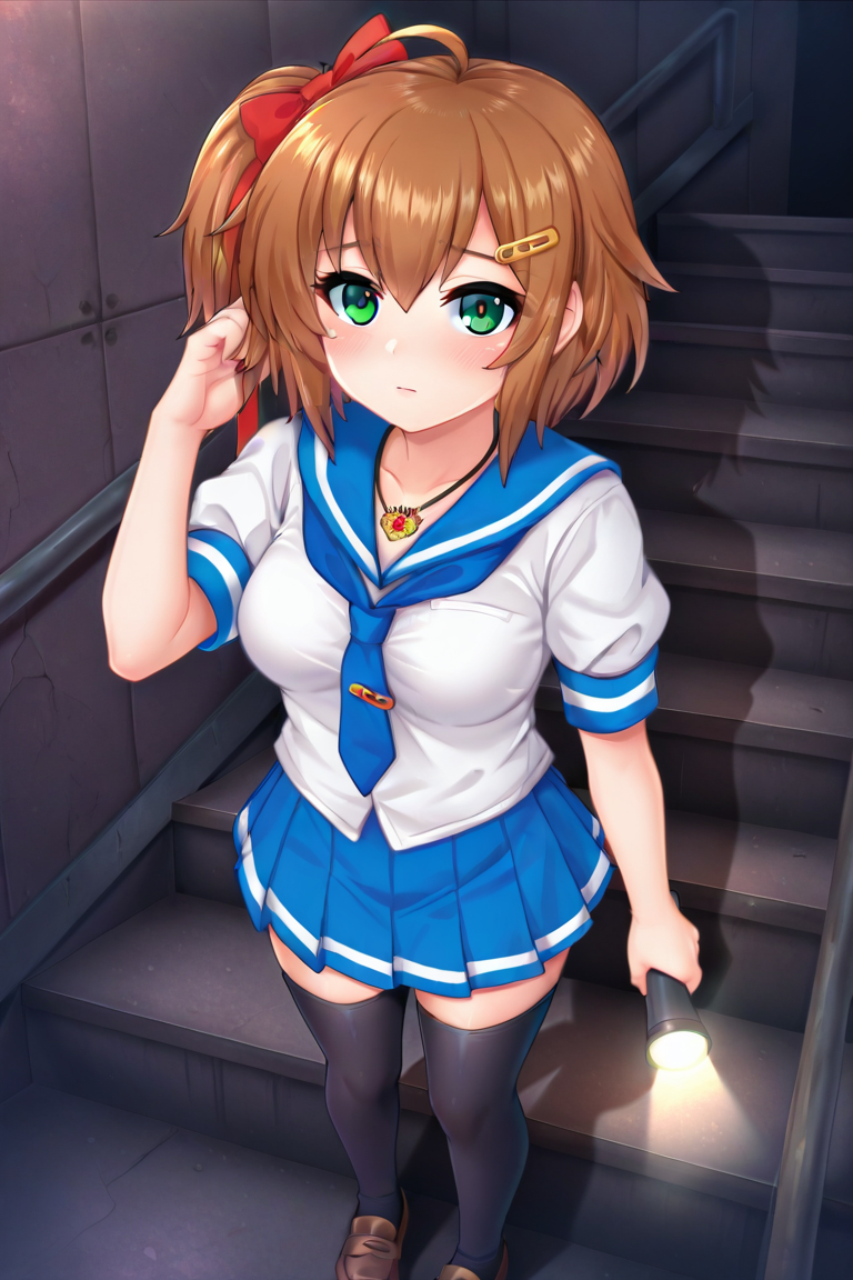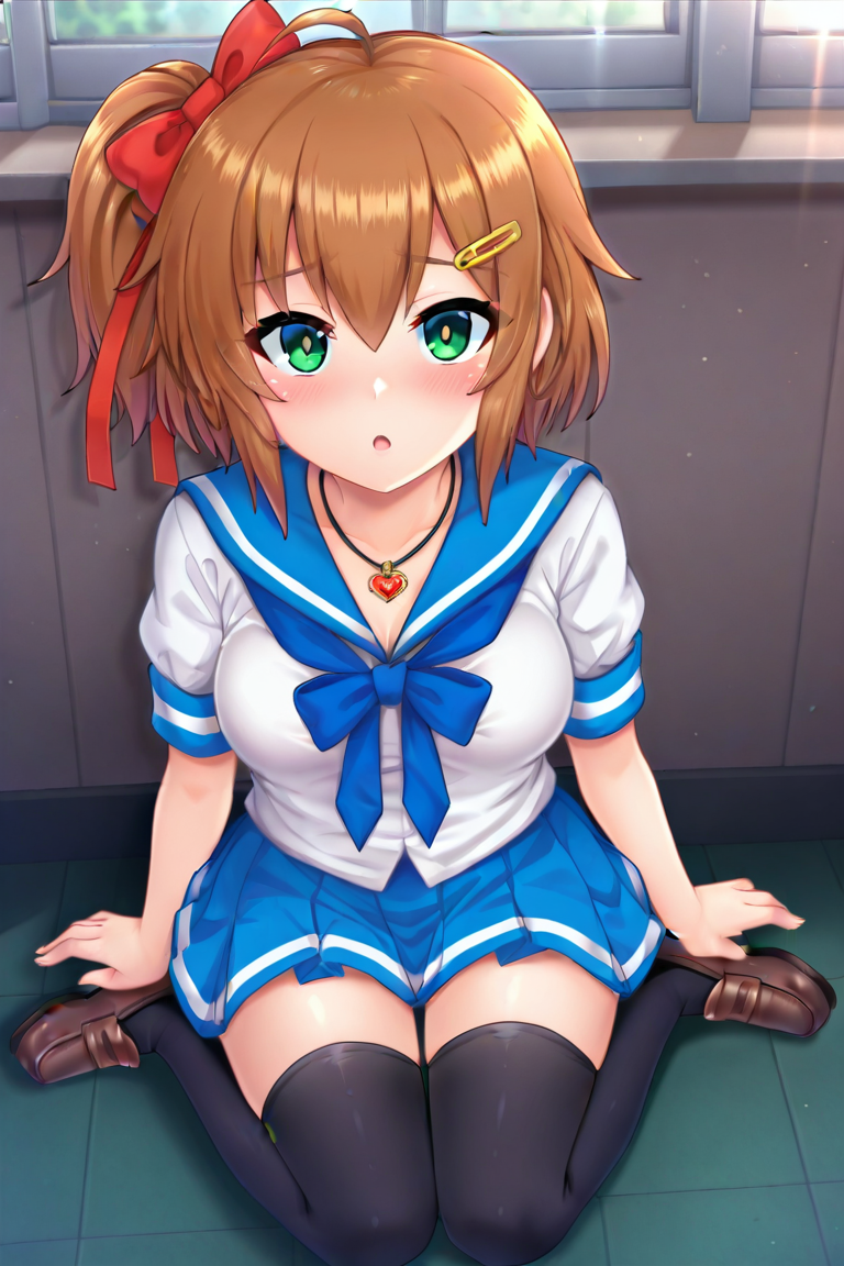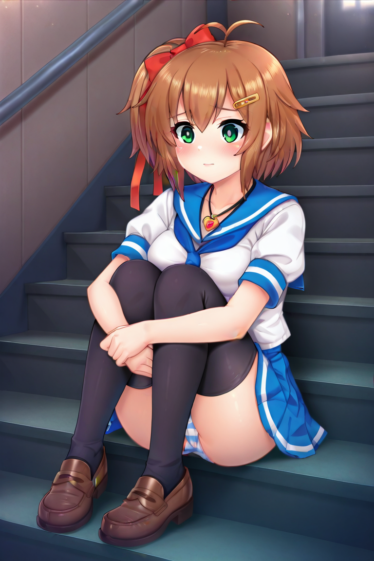 akari_outfit1,sailor collar,school uniform,white shirt,short sleeves,necklace,blue skirt,pleated skirt,black thighhighs,loafers