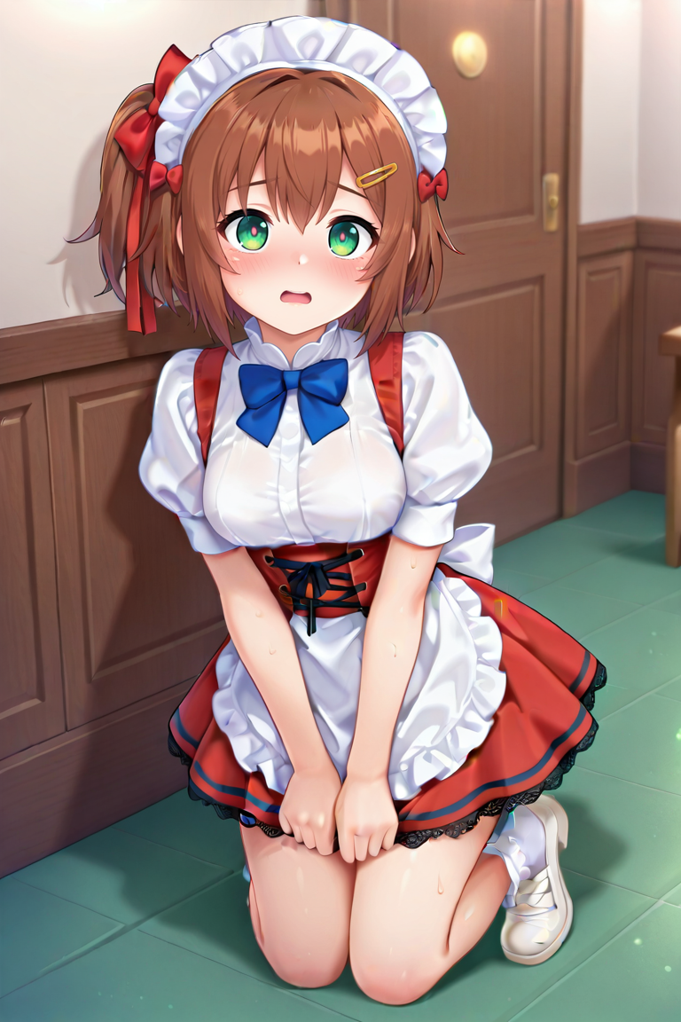 akari_outfit2,frilled choker, frills, maid, maid apron,frilled apron,waist apron, white apron,maid headdress, puffy short sleeves,white thighhighs,white legwear,wrist cuffs,collar