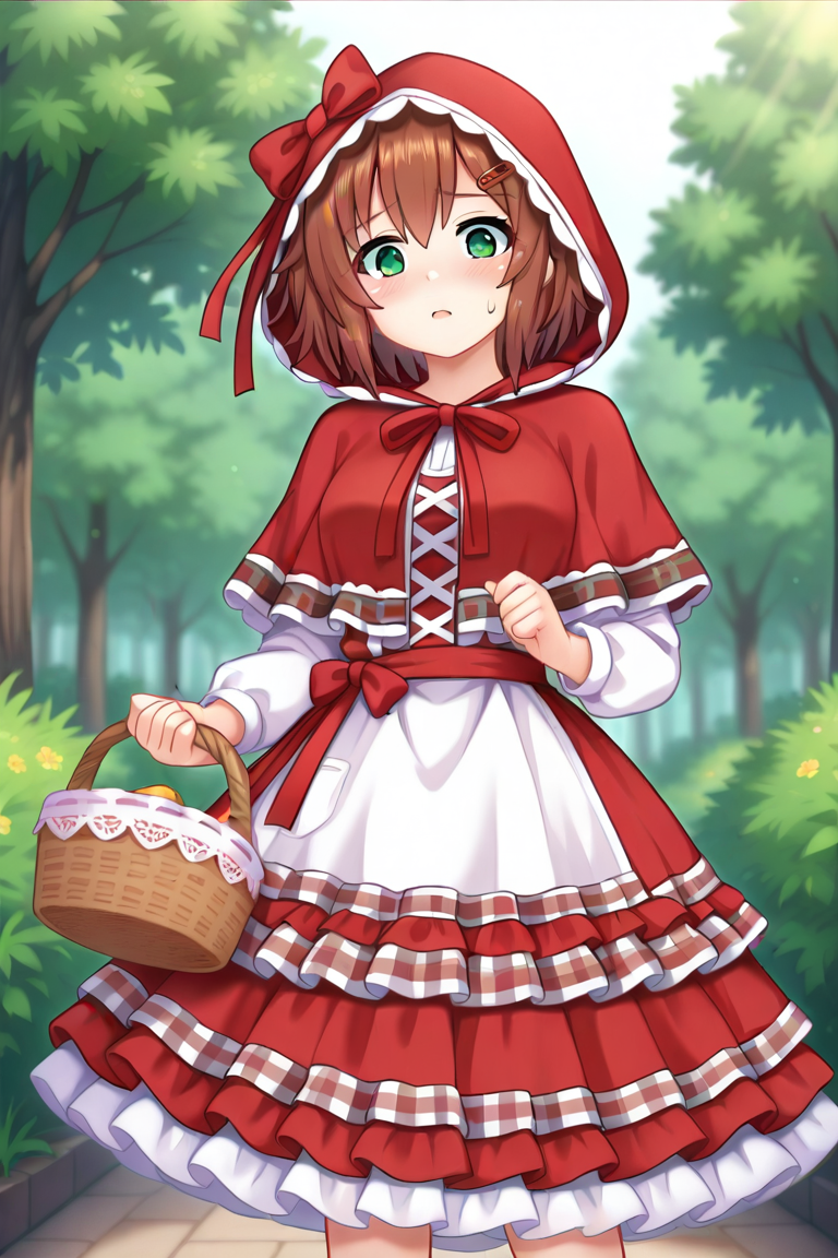 ghosthill_akari,green eyes,short hair,brown hair,hairclip,red bow,hair bow,breasts,