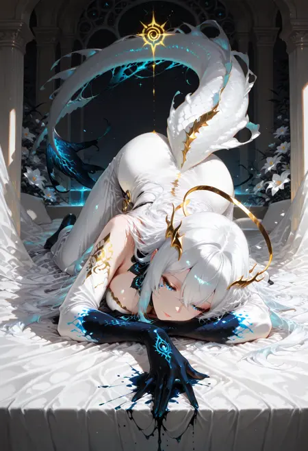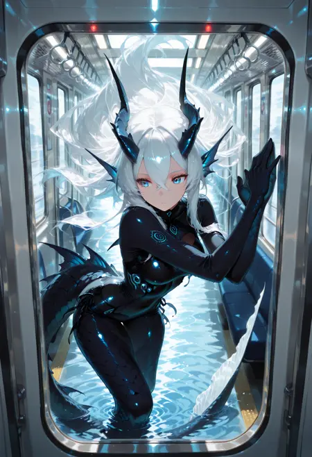 ✔ トリガー: aokami no uta, 1girl, 青い目, 長髪, 鱗の尾, 白髪, 魚の耳, 角, モンスター娘, 鱗,