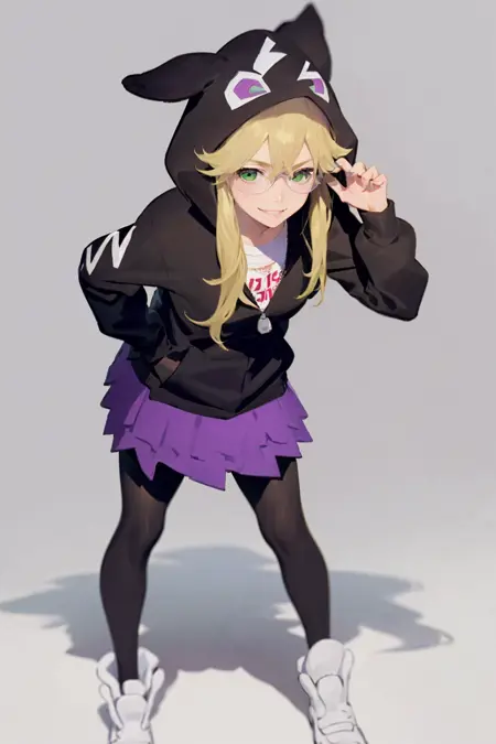カジュアルウェアプロンプト:glasses, hoodie, animal hood, hood up, purple skirt, white shoes, black pantyhose
