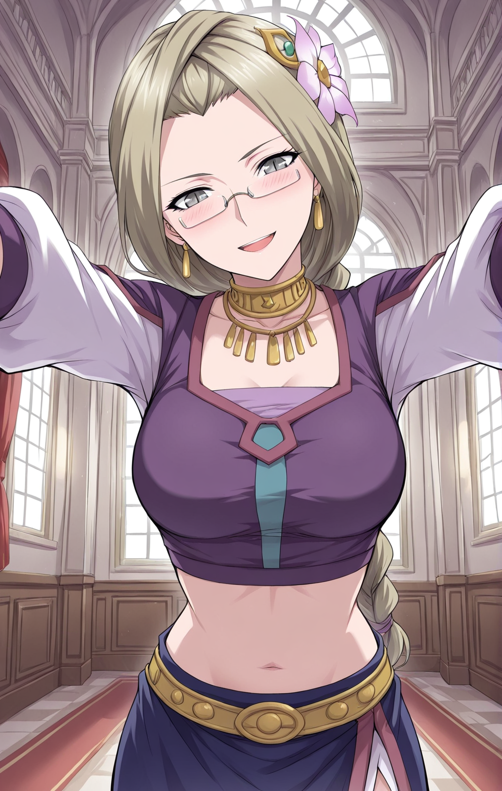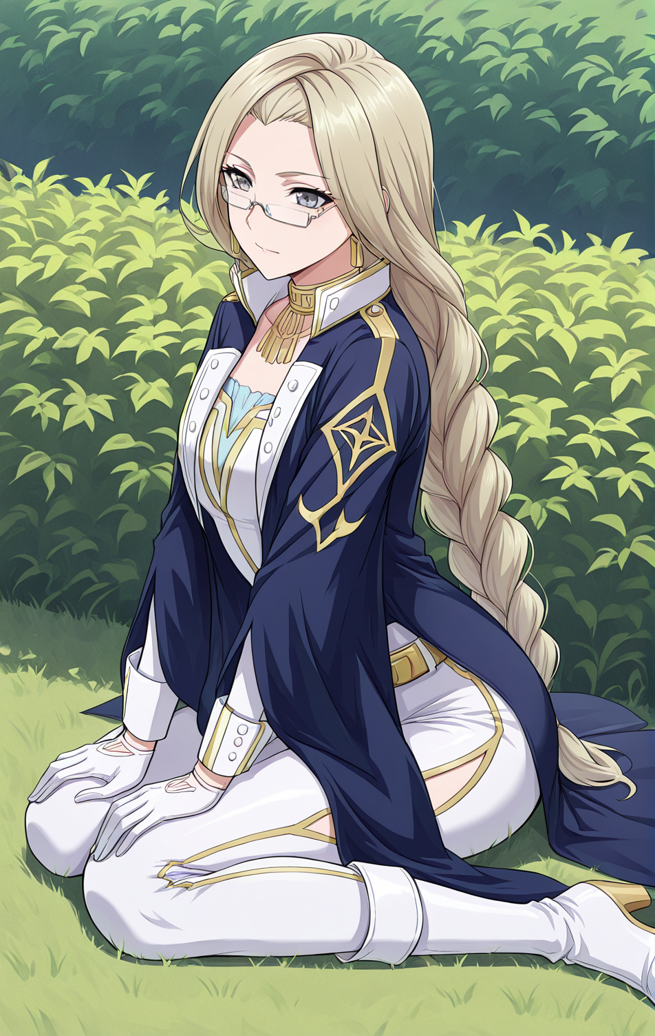 | 학습된 단어 | Jue, 1 girl, solo, light blonde hair, long braid back, side part bangs, gray eyes, glasses, rectangular glasses, gold earrings,복사됨! Ji_regal, white and gold bodysuit, dark blue coat, white high collar, gold trim, open coat, long sleeves, ornate buttons, gold-trimmed edges, blue chest lining, golden belt, thigh slit, white gloves, white and gold boots복사됨! Ji_mystic, cropped purple top, open chest cutout, gold ring centerpiece, white sleeves, wide purple cuffs, dark blue skirt, side slit skirt, gold ornamental belt, midriff exposed, gold choker necklace, layered gold necklace, silver bracelet, ornamental jewelry복사됨! |