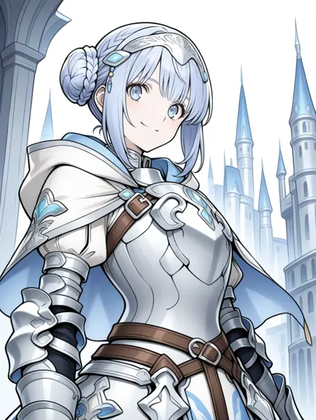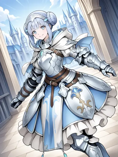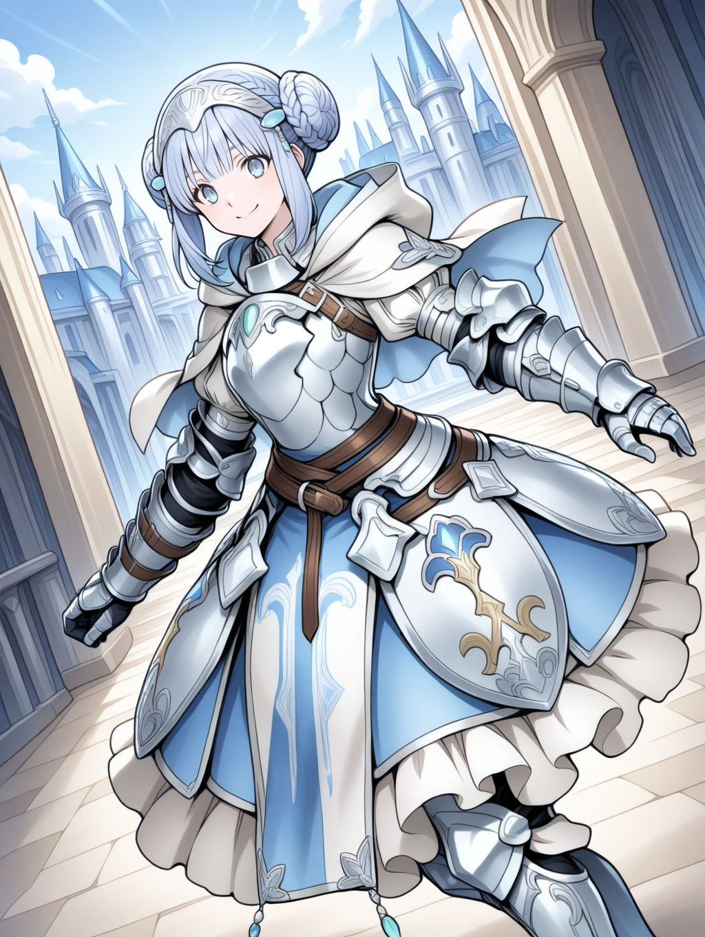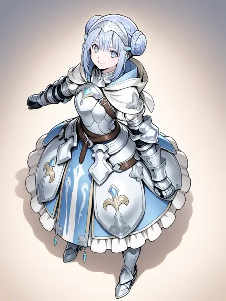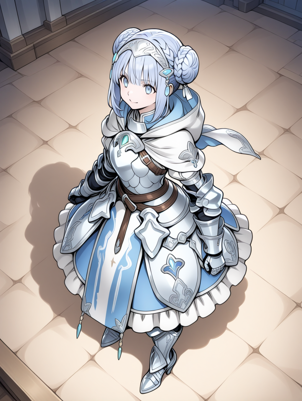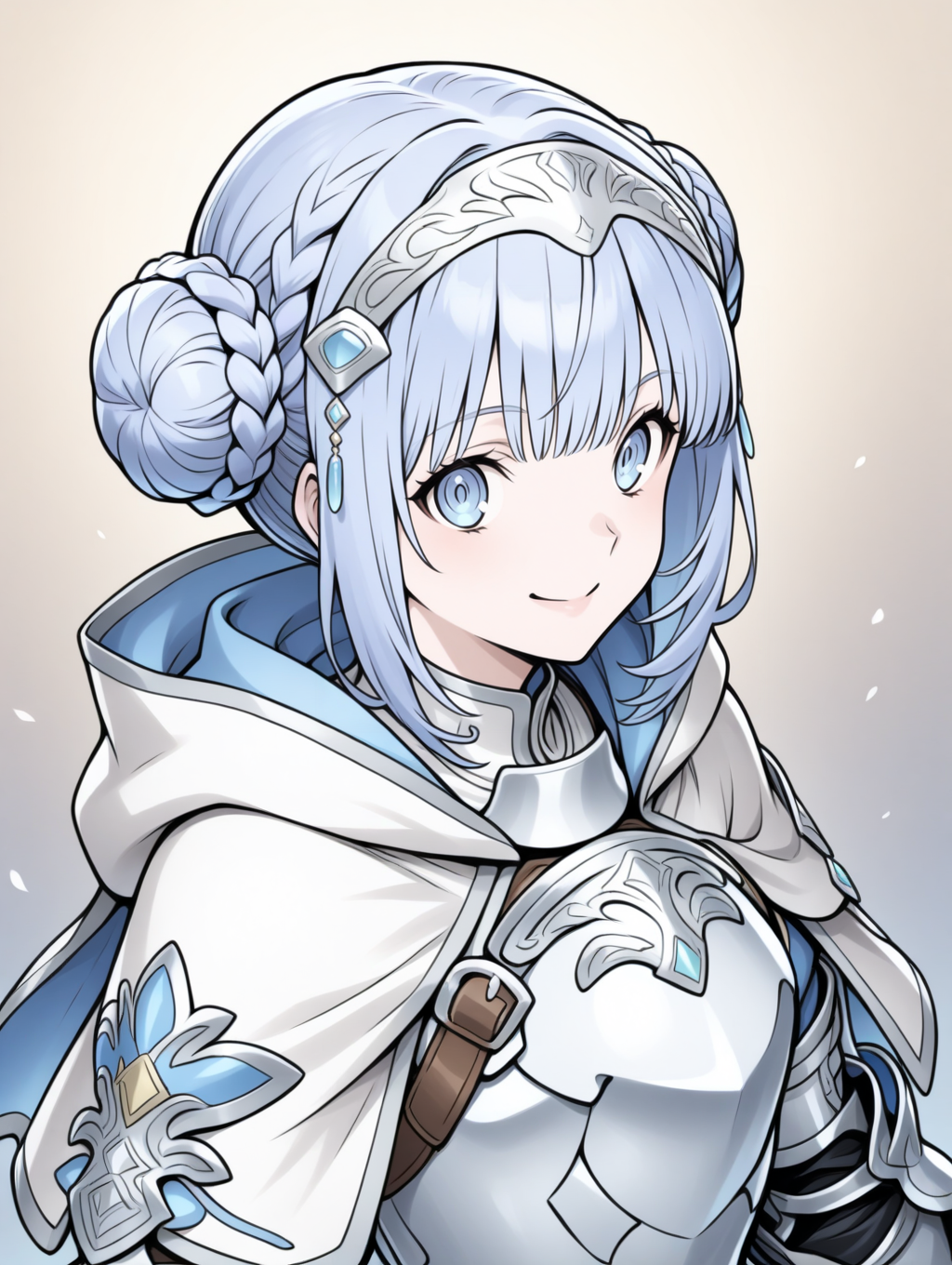 prompt example :retelisia,blue eyes,blue silver hair,braided bun,hair ornament,hooded capelet,hood down,braid,capelet,armored dress,gauntlets,greaves,low double bun,