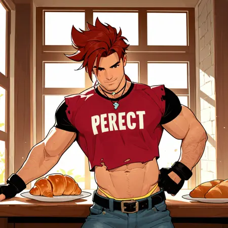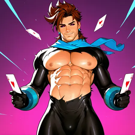 <lora:GAMBIT:1> gambit, 남성 중심, 1남자, 혼자, 안면 털, 갈색 머리, 수염 자락, 근육질, 미소, 근육질 남성, 시청자 보는 시선, 장갑, 짧은 머리, 복근, 손가락 없는 장갑, 유방근, bara, 배꼽, 붉은 눈, 검은 장갑, 성숙한 남성, 셔츠, 보석, 수염 자락