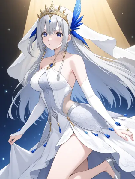 prompt example :hanayome,silver long hair,blue eyes,whitt dress,hair ornament,gold tiara,blue feathers,bridal gauntlets,high heels,