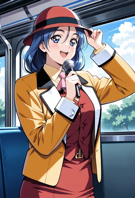 Base: n_misato, 1girl, retro artstyle, solo, long hair, blue hair, parted bangs, hair between eyes, blue eyes, misato uniform, misato red headwear, red ascot, yellow jacket, collared shirt, red vest, belt, red skirt, pencil skirt, long sleeves, open jacket,