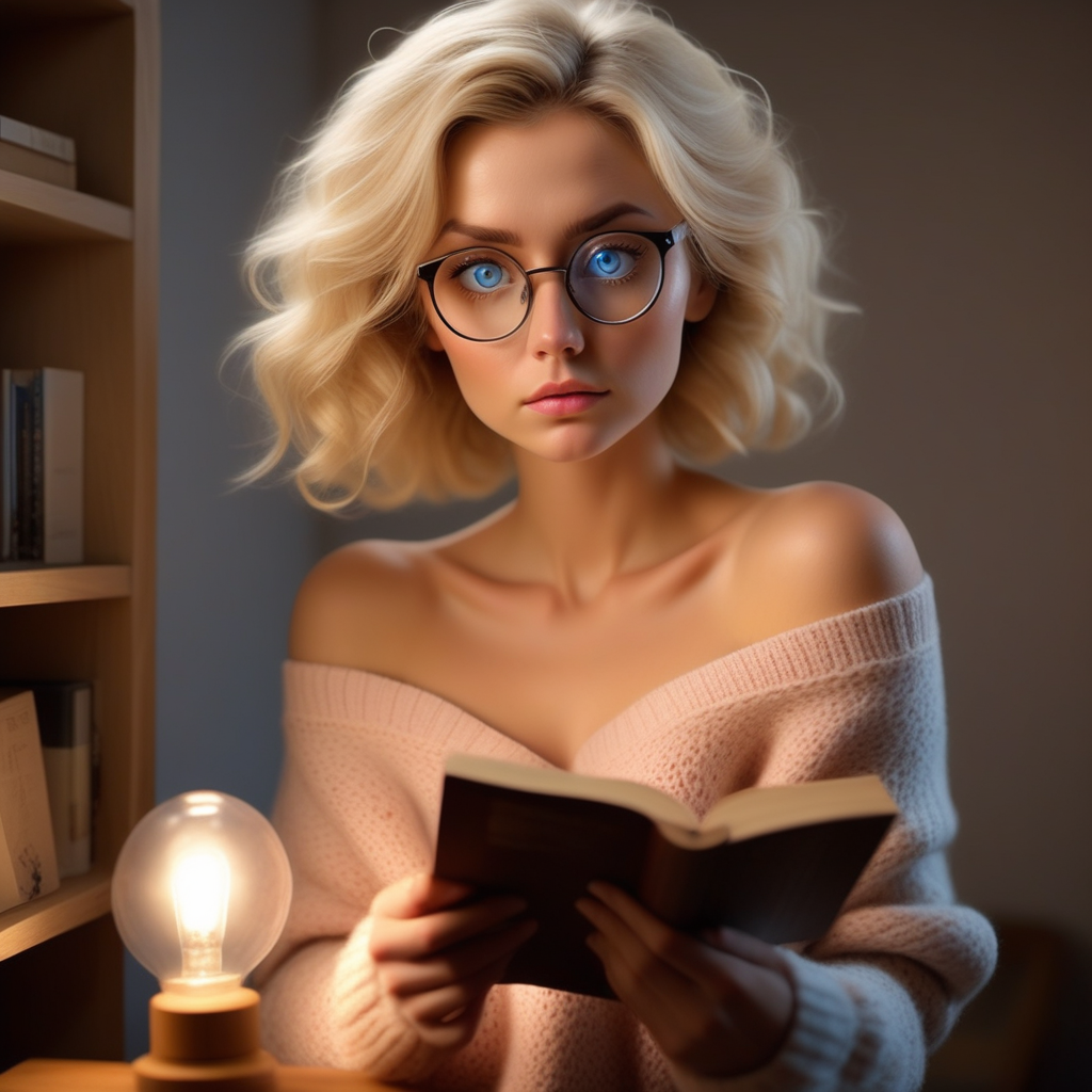 platinum blonde hair, messy bun, bangs, large round glasses, pale skin, blue eyes, cute face, bookish, shy, flustered, awkward pose, lip bite, large breasts, hourglass figure, cardigan, lingerie, bookshelf, soft lighting, bedroom, studio backdrop, biting lip, flushed cheeks