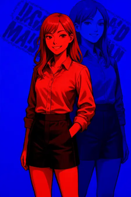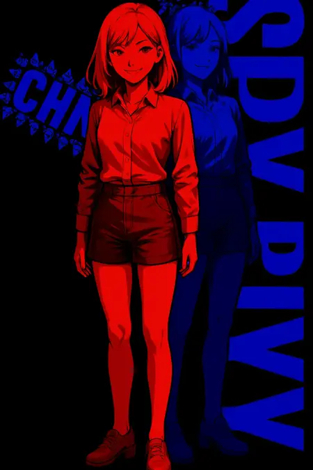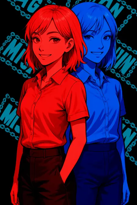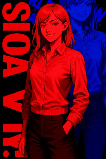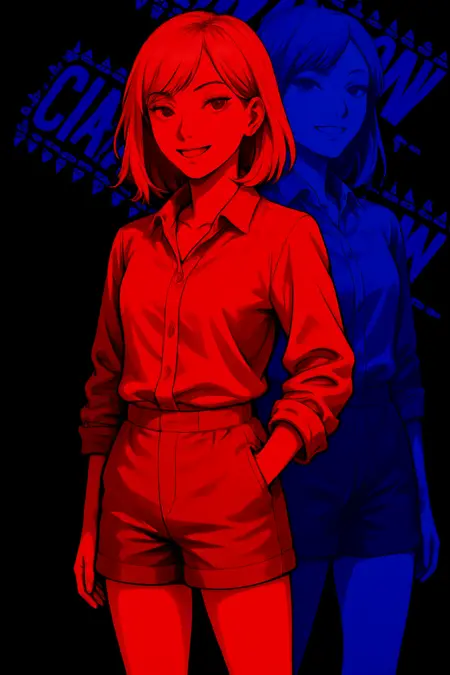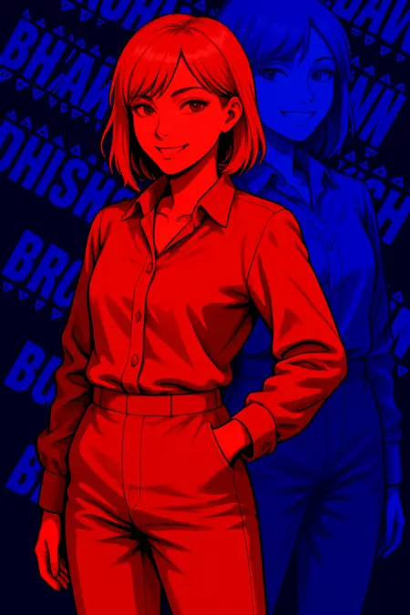 は、鋭いアニメ風のラインワークとグラフィックデザインのミニマリズムを融合させ、目の前に浮かぶような「ナキーダイエクス3D」効果を生み出す、大胆な二色調のイラストスタイルです。