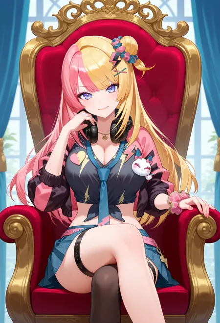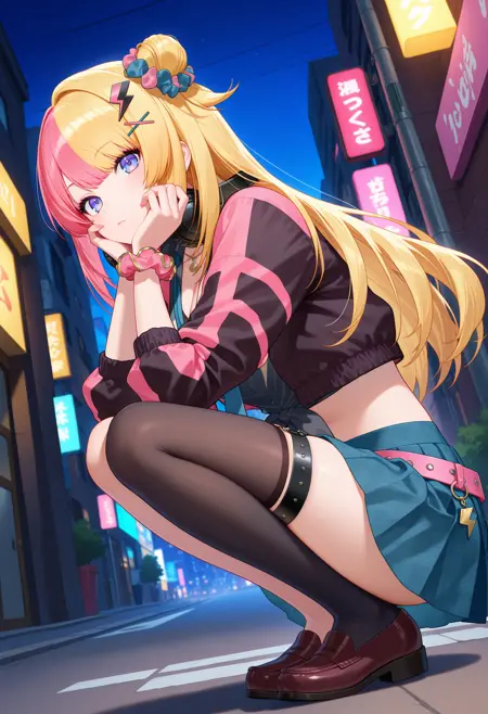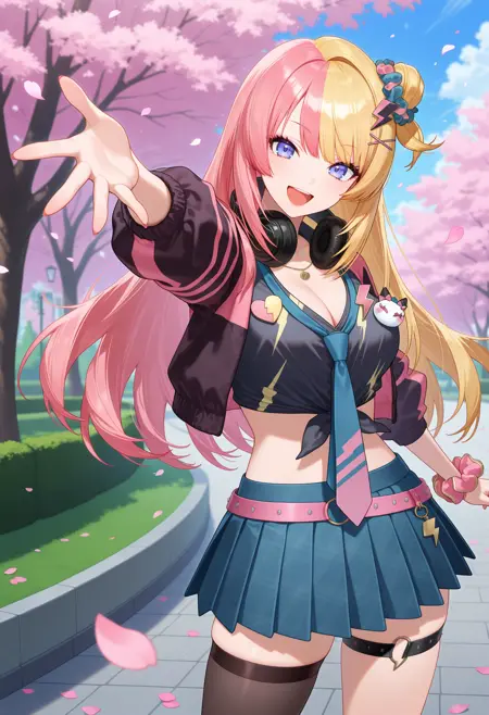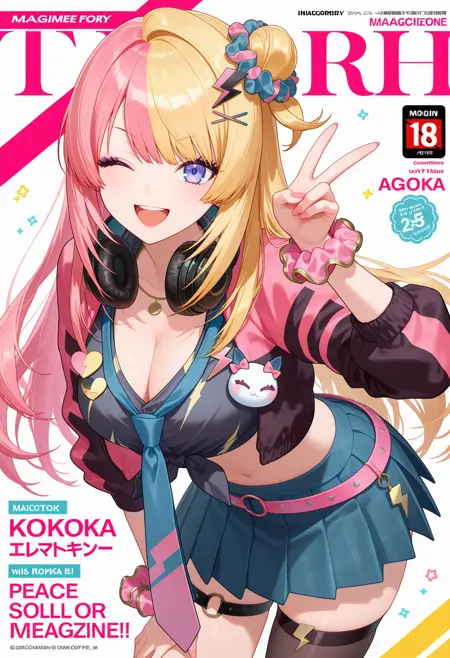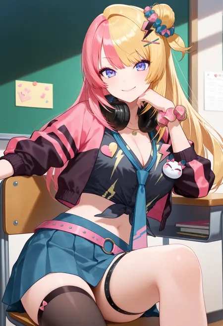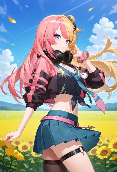 outfit1aakotoka, 긴 머리, 이색 머리카락, 단일 머리 뭉치, 머리끈, 머리 장식, 파란 눈, 목에 걸린 헤드폰, 목걸이, 파란 넥타이, 검은 셔츠, 분홍 재킷, 손목 끈, 허리 부분, 분홍 벨트, 파란 치마, 허벅지 스트랩, 단일 허벅지 스타킹, 검은 허벅지 스타킹