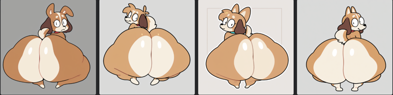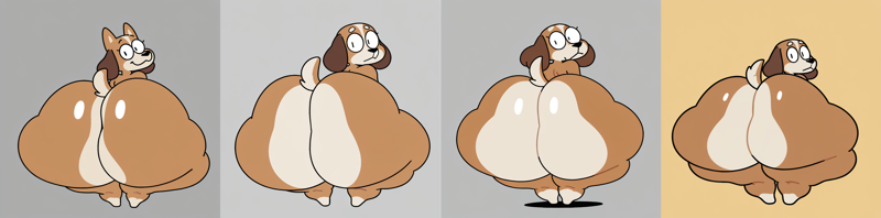 Prompt: masterpiece, best quality, supxrfxx, solo, dog, furry, full body, featureless feet, round eyes, line eyes, from behind, looking back, brown fur, white countershading, hyper butt,