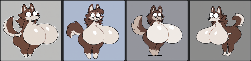Prompt: masterpiece, best quality, supxrfxx, solo, wolf, long snout, brown fur, white countershading, furry, full body, featureless feet, round eyes, line eyes, hyper breasts
