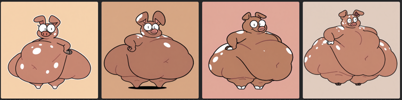 Prompt: masterpiece, best quality, supxrfxx, solo, pig, brown body, white spots, furry, full body, featureless feet, round eyes, line eyes, hyper belly, hyper hips, hands on hips, 4 fingers,