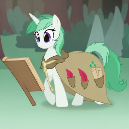(clover the clever, female, unicorn, light mint green coat, teal and dark teal mane and tail, purple eyes, wearing a rustic brown cloak with a large side pocket, pocket contains a red feather, two rolled scrolls tied with string, and glowing green plant-like symbols, The cloak is fastened with a woven straw-like rope)