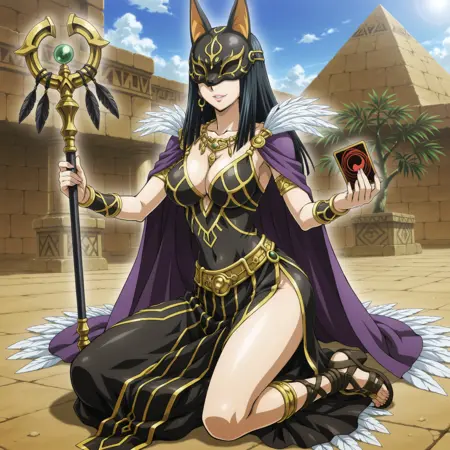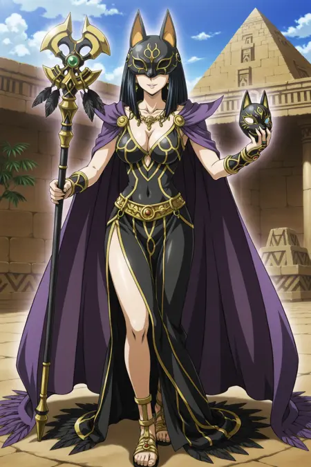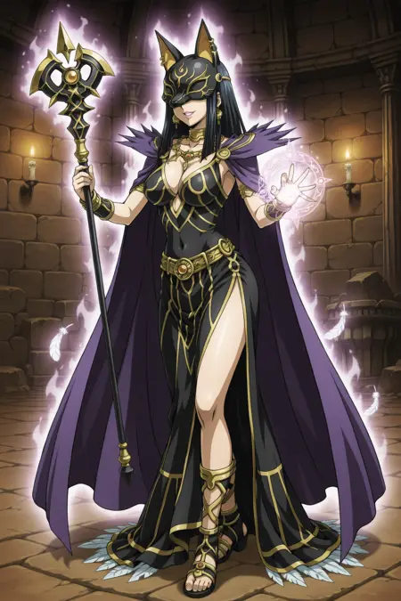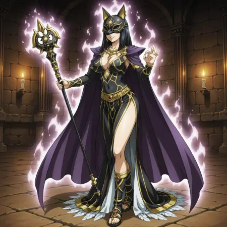 yugioh_card_style, yugioh_card_for_gravekeeper_spiritualists, 嘴唇, 黑发, 长黑发, 直发, 耳环, 精致项链, 大胸, 锁骨, 遮盖的肚脐, 胸部曲线, 微笑, 无眼豺狼面具, 面具遮住眼睛, 紫色斗篷, 黑金长裙, 礼服, 装饰腰带, 大腿开叉裙, 长裙, 金色镶边, 白色布料, 羽毛, 裸露大腿, 无趾鞋, 权杖