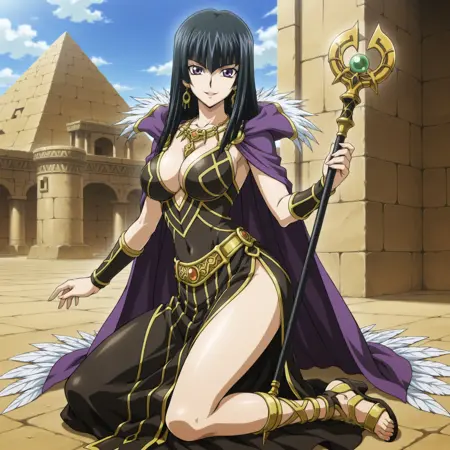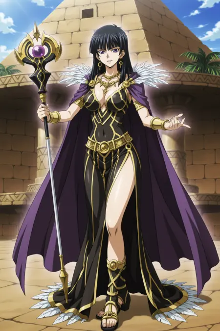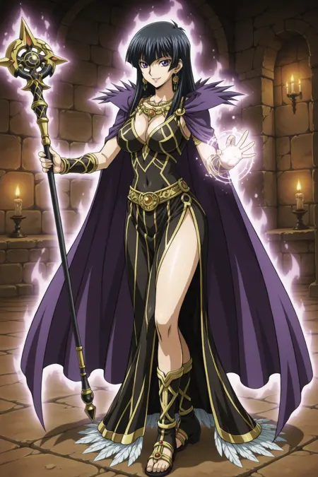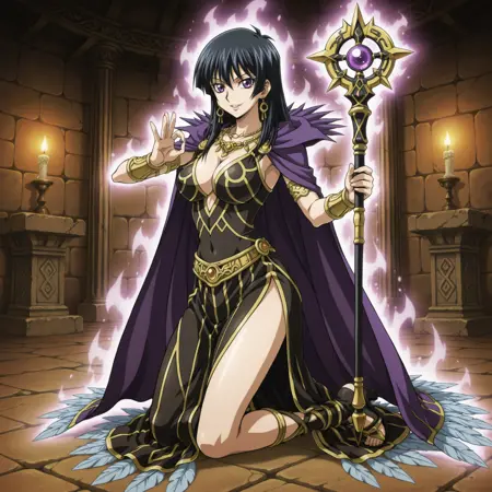 yugioh_card_style, yugioh_card_for_gravekeeper_spiritualists, 紫色眼睛, 嘴唇, 黑发, 长黑发, 直发, 耳环, 精致项链, 大胸, 锁骨, 遮盖的肚脐, 胸部曲线, 微笑, 紫色斗篷, 黑金长裙, 礼服, 装饰腰带, 大腿开叉裙, 长裙, 金色镶边, 白色布料, 羽毛, 裸露大腿, 无趾鞋, 权杖