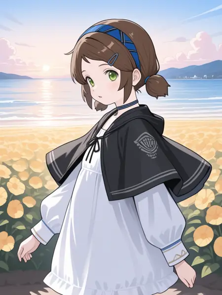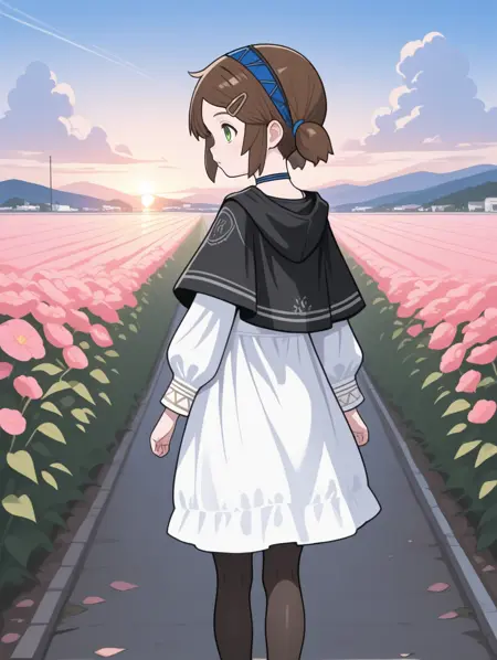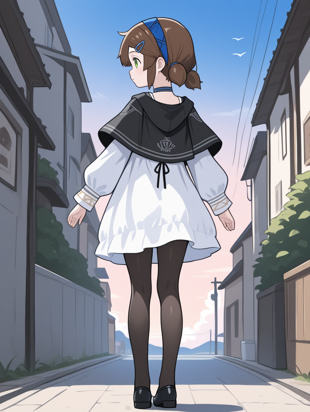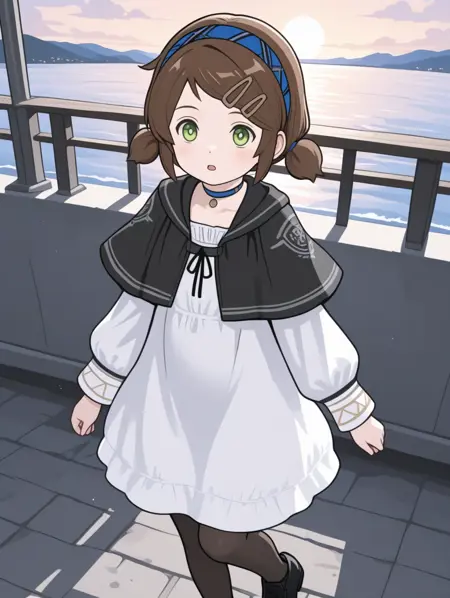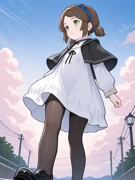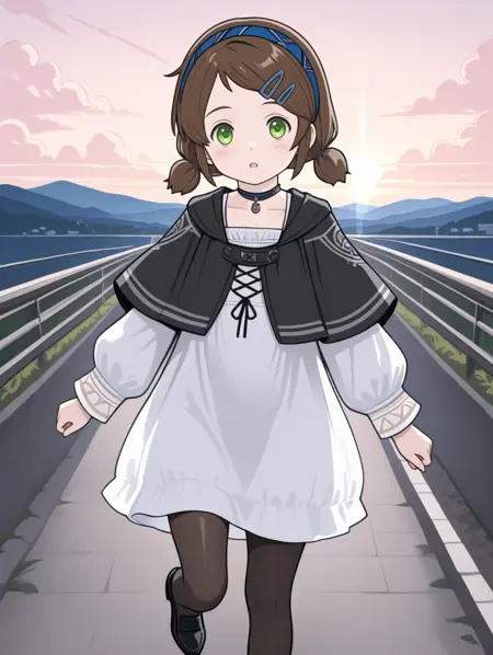 프롬프트 예시: yousyouki,solo,brown hair,short hair,short twintails,green eyes,hairclip,hairband,choker,black capelet,white dress,long sleeves,black pantyhose,black footwear,
