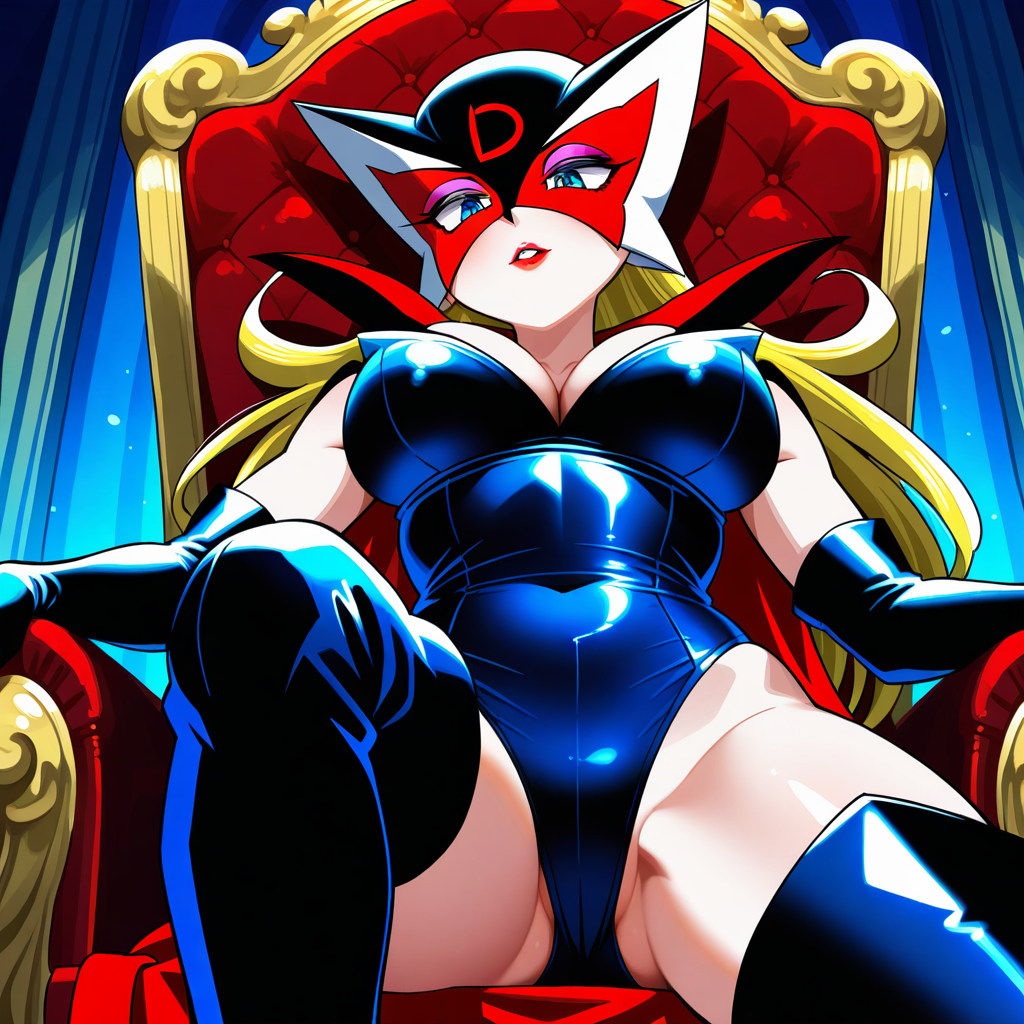 YT_Doronjo, 1girl, solo, mask, gloves, blonde hair, long hair, large breasts, blue eyes, lipstick, cape, elbow gloves, black gloves, thighhighs, cleavage, thigh boots