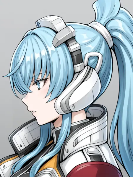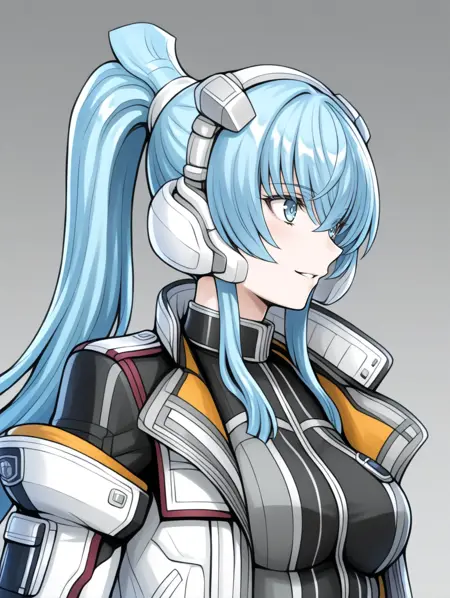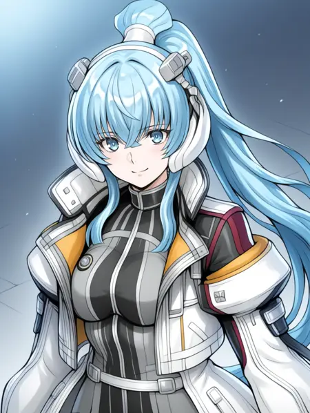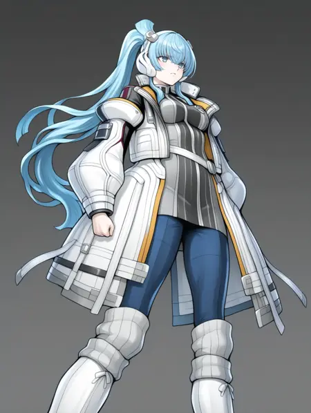 プロンプト例: marieru,marieru,blue eyes,blue hair,long hair,ponytail,open jacket,detached sleeves,long sleeves,grey dress,long sleeves,blue pants,vertical-striped leg cover,headgear,