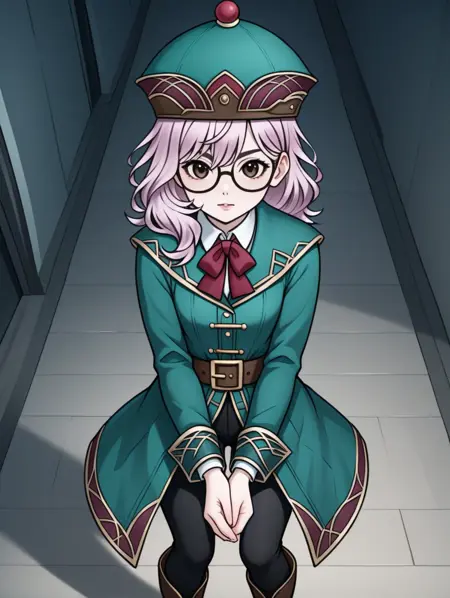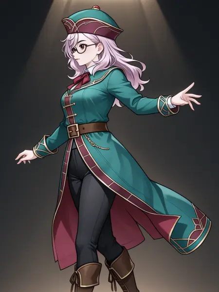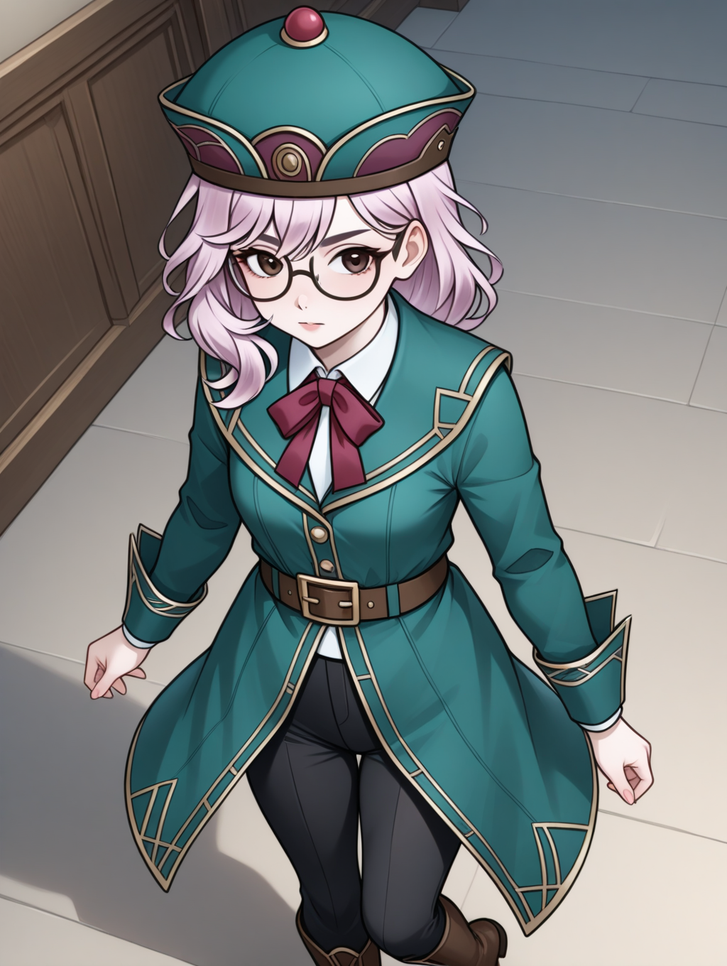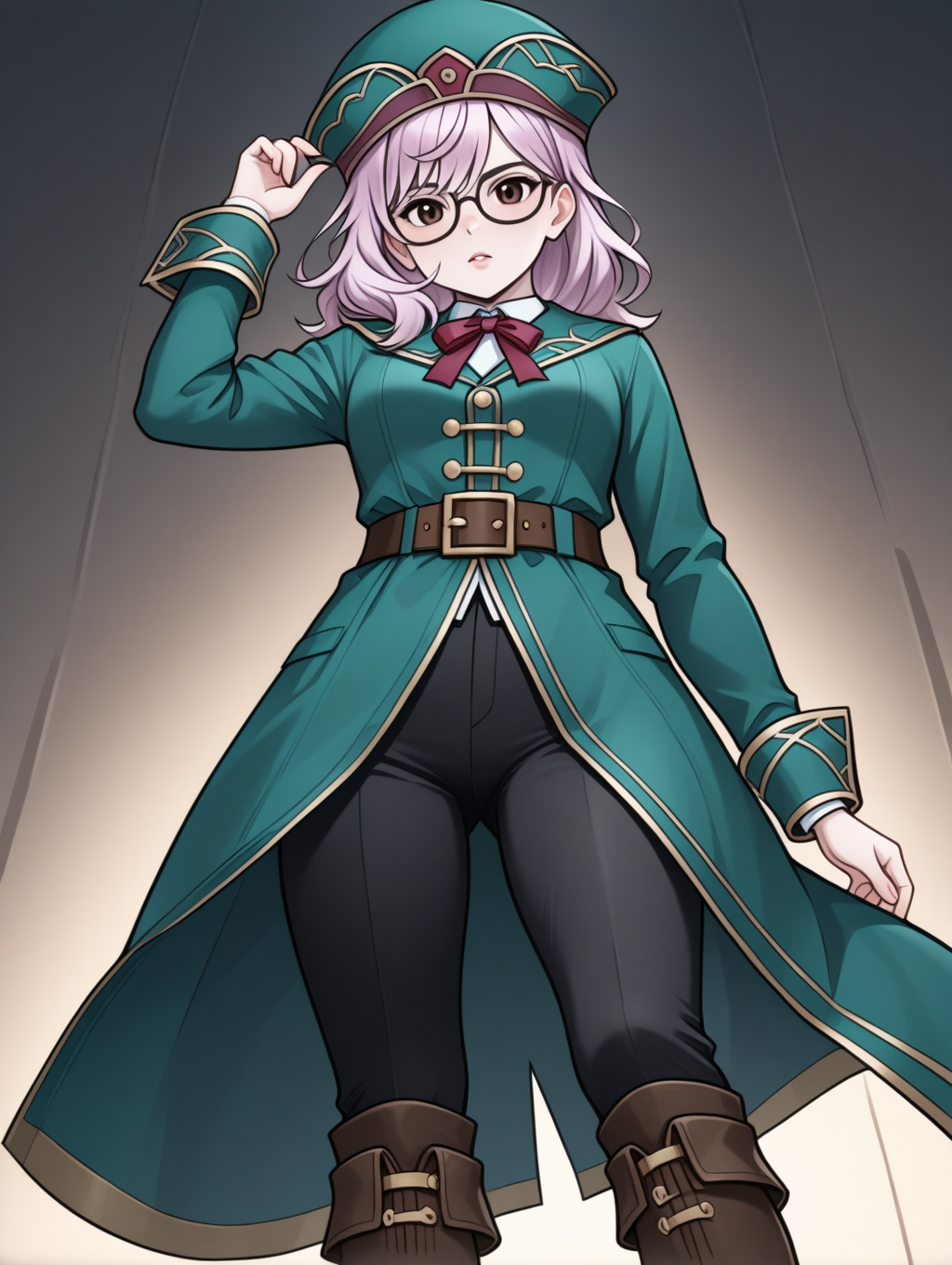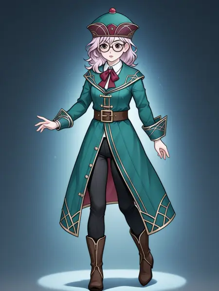 プロンプト例: merutelia,pink hair,brown eyes,green hat,glasses,green coat,ribbon,long sleeves,belt,boots,black pants,
