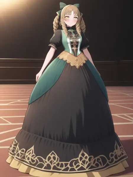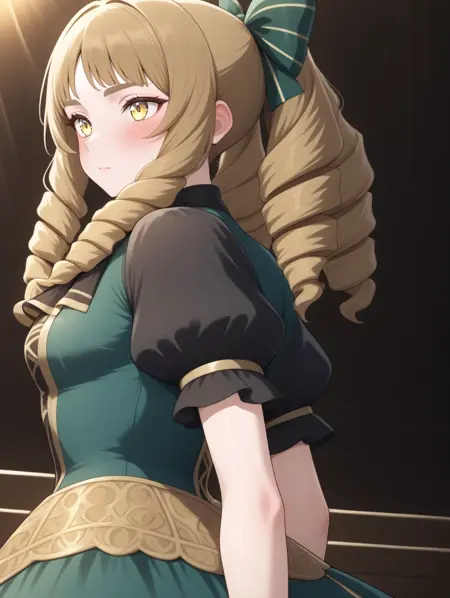 プロンプト例: SO6pafiy,金髪,茶髪,髪リボン,黄色い目,ドリル髪,シングル,黒いふわふわの短い袖,黒いドレス,緑のドレス,