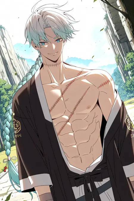 habaek, habaeklv99, 하얀 머리, 그라데이션 머리, 아쿠아 머리, 파란 눈, 단일 땋은 머리, 땋은 토끼 꼬리, 긴 머리, 나눈 앞머리, 흉터
