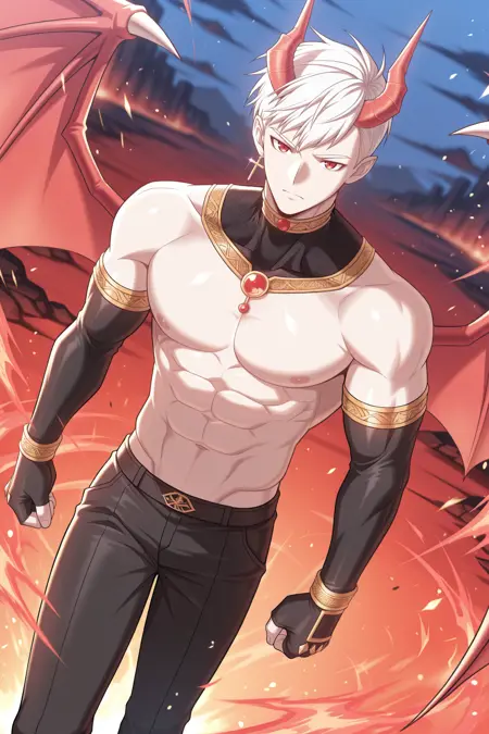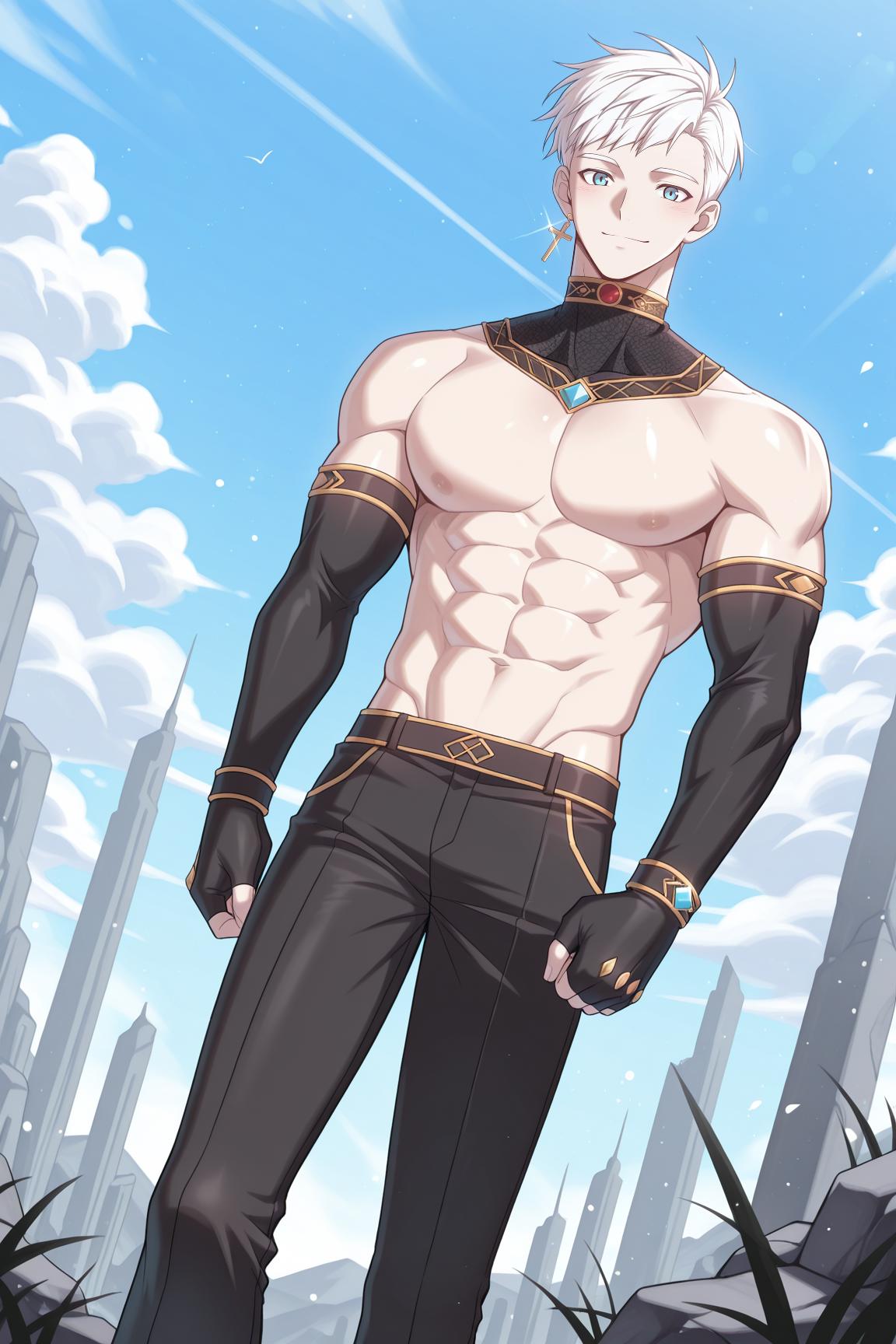 ブリアルのグローブ、肘まで長めの手袋、指なし手袋、黒い手袋、黒いズボン、上半身裸の男性