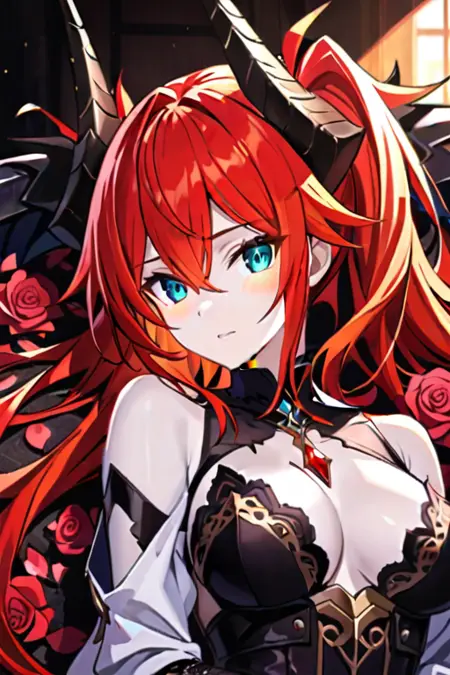 服装やその他のプロンプトは変更可能です:1girl, dragon girl, horns, fire, red skirt, pantyhose, ribbon, red hair, solo, sailor collar, twintails, bangs, black legwear, pleated skirt, gauntlets, dragon horns, large breasts, armor, miniskirt, red sailor collar, armored boots, knee boots, thighhighs, floating hair, red neckwear, dragon tail