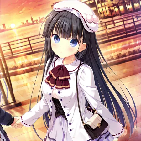 tokisaka nino, seifuku_honkoh, 1girl, solo,long hair, very long hair, black hair, purple eyes,black ribbon, ribbon on one side, mini hat, hat,school uniform, black uniform, white skirt, pleated skirt, skirt, long sleeves, shirt, buttons, black thighhighs, thighhighs, striped bow, bow, red bow, red bowtie, bowtie, ribbon