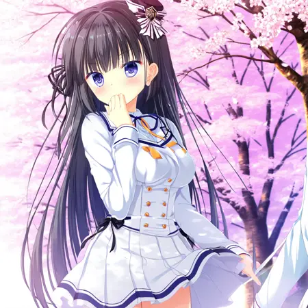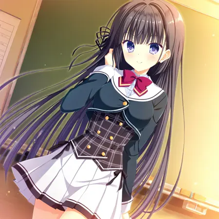 tokisaka nino, seifuku_honkoh, 1girl, solo,long hair, very long hair, black hair, purple eyes,black ribbon, ribbon on one side, mini hat, hat,school uniform, black uniform, white skirt, pleated skirt, skirt, long sleeves, shirt, buttons, black thighhighs, thighhighs, striped bow, bow, red bow, red bowtie, bowtie, ribbon