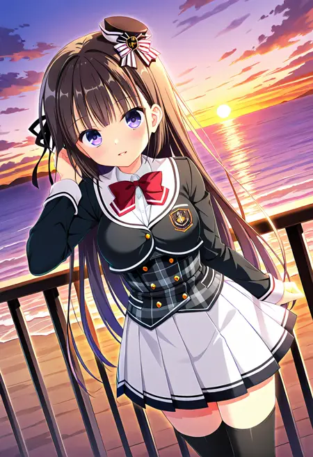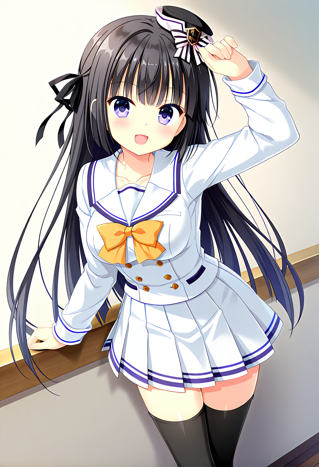 tokisaka nino, seifuku_honkoh, 1girl, solo, long hair, very long hair, black hair, purple eyes, black ribbon, ribbon on one side, mini hat, hat, school uniform, black uniform, white skirt, pleated skirt, skirt, long sleeves, shirt, buttons, black thighhighs, thighhighs, striped bow, bow, red bow, red bowtie, bowtie, ribbon