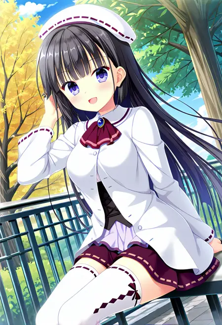 tokisaka nino, solo, 1girl, casual003, casual, long hair, very long hair, floating hair, black hair, purple eyes, shiny hair, bangs, blunt bangs, hat, white headwear, white jacket, white coat, jacket, shirt, white shirt, long sleeves, ascot, red ascot, skirt, miniskirt, pleated skirt, layered skirt, thighhighs, white thighhighs, ribbon trim, jewelry