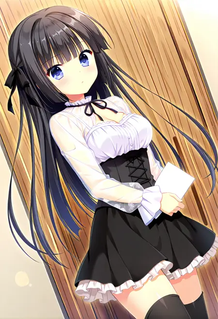 tokisaka nino, solo, 1girl, casual001, casual, long hair, very long hair, black hair, purple eyes, hair ribbon, black ribbon, purple ribbon, shirt, white shirt, long sleeves, neck ribbon, ribbon, skirt, miniskirt, black skirt, frilled skirt, thighhighs, black thighhighs, frills