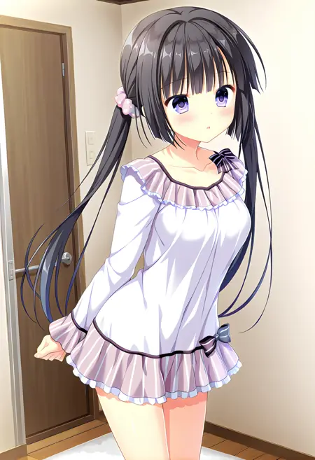 tokisaka nino, solo, 1girl, long hair, black hair, purple eyes, bangs, twintails, collarbone, cleavage, scrunchie, hair scrunchie, hair ornament, pajamas, long sleeves