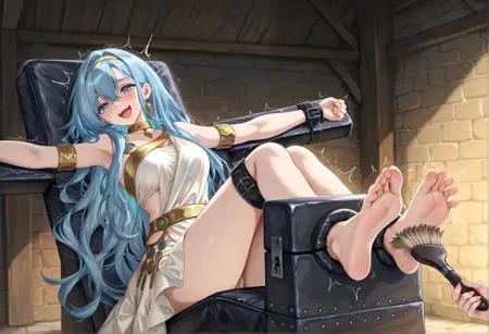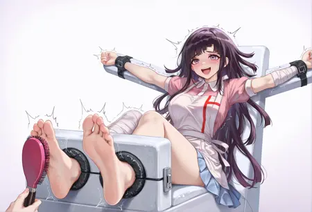 forced legs apart, spread legs, bound legs, bound arms, restrained, feet, soles, tickling thigh, tickling armpits,