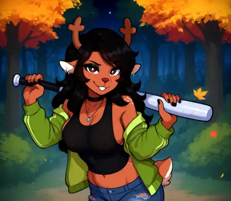 anthro, reindeer, buck teeth, freckles, brown eyes, brown fur, black hair, medium hair, wavy hair, parted bangs, thick eyebrows, black eyeshadow, reindeer antlers, deer tail, deer ears
