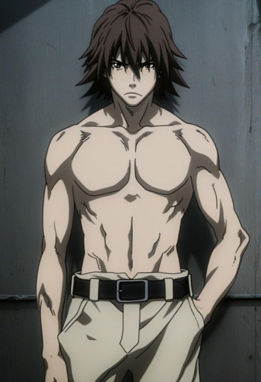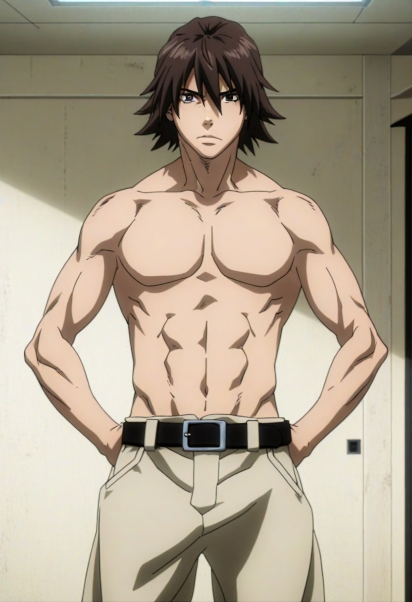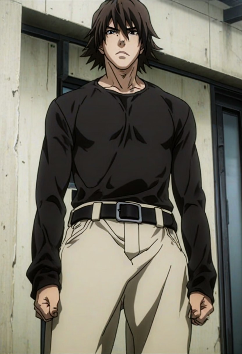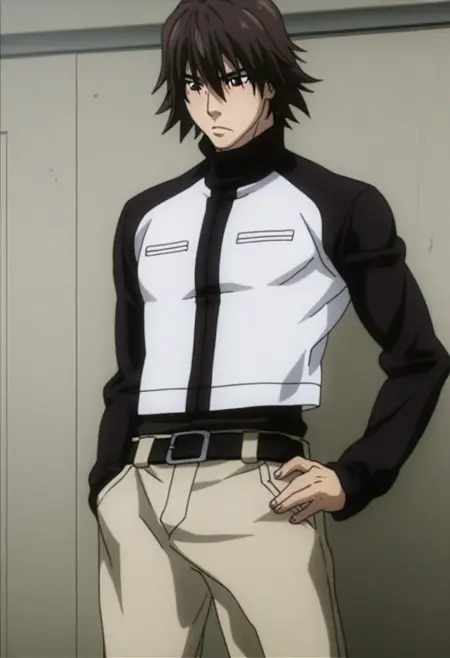 Jin Kanzaki, dark brown hair, dark brown eyes, turtleneck cropped jacket, long sleeves, raglan sleeves, black undershirt, belt, light brown pants