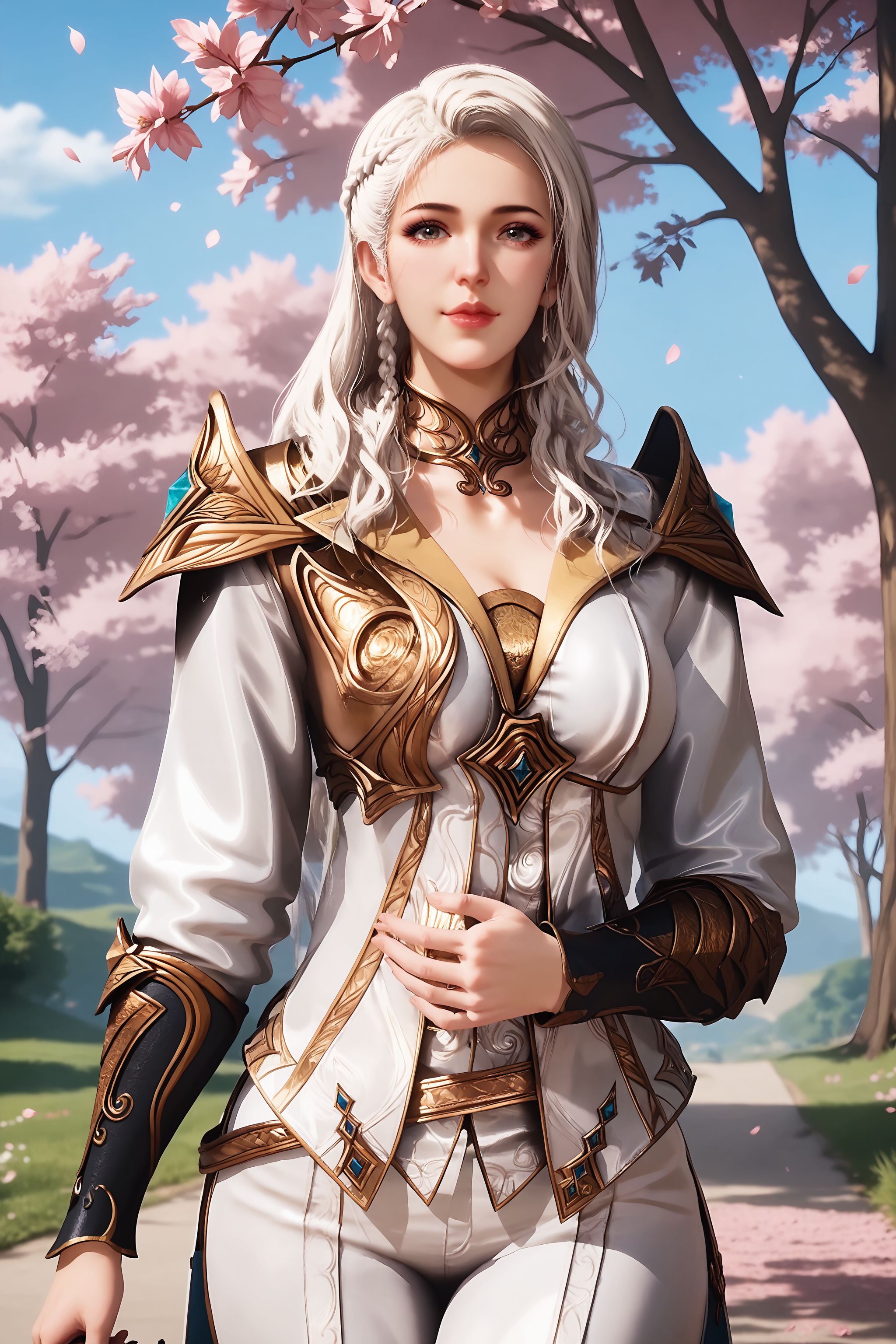 1girl, solo, armor, white hair, braid, long hair, shoulder armor, white dress