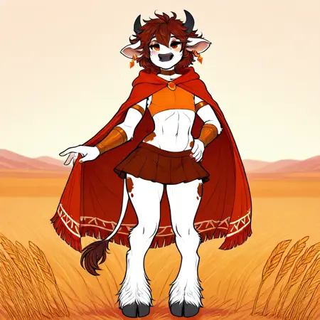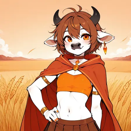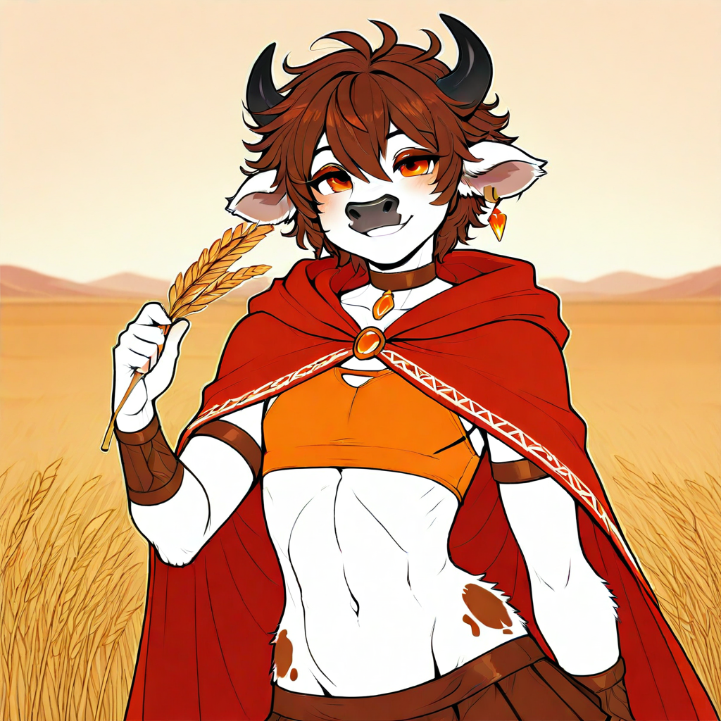 | 학습된 단어 | brown choker, orange cloth crop top, red-brown cloak, brown pleated miniskirt, amber brooch, jewelry- amber gemstone, necklace, gold arm band, gold thigh band, gold earrings,복사됨! BW(character), flat chest, cow, male, femboy, brown hair, orange eyes, messy hair,복사됨! |