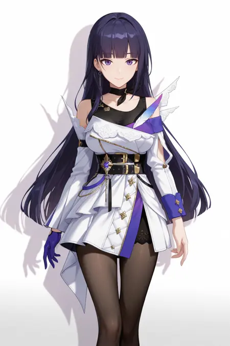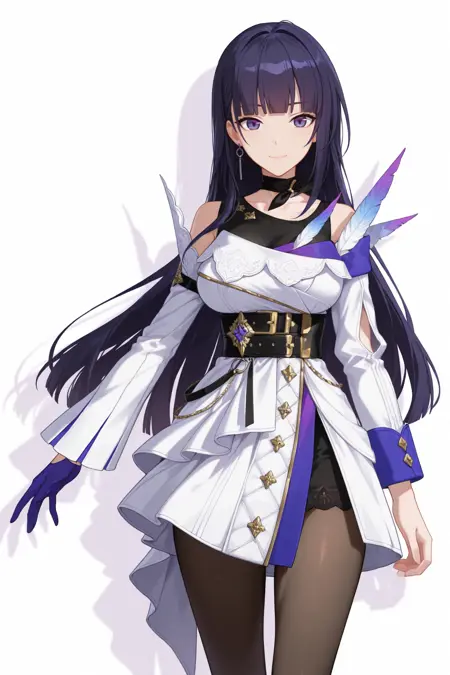 DefOutfit,白色连衣裙,层叠裙装,黑色背心,白色袖子,单侧分离袖子,不对称袖子,露肩,袖口开衩,层叠裙摆,白色裙摆,侧边开衩,羽毛,单耳环,丝带项圈,黑色项圈,裙内衬衫,多条腰带,黑色腰带,金色扣环,单手套,紫色手套,黑色连裤袜,踝靴