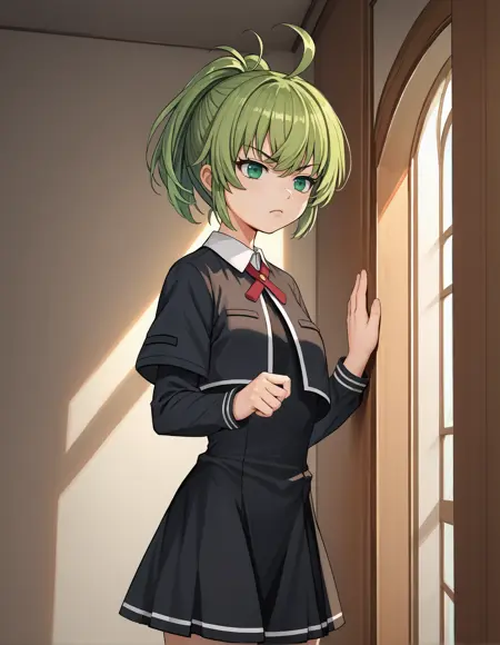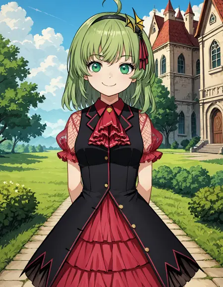 冬季服装: mgrcannameru, annwtr, 短马尾,红色发结,红色领带,白色衬衫,白色长蓬松袖子,红色层叠裙子,白色花边,黑色腰带蝴蝶结,黑色连裤袜