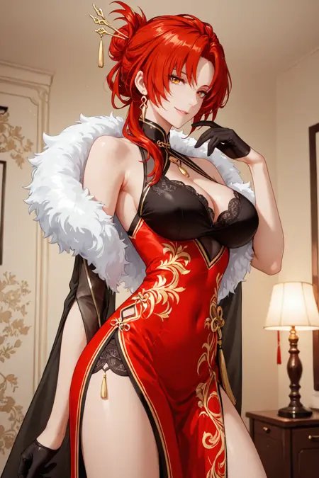 jewelry,earrings,half gloves,black gloves,silk gloves,white fur trim,Hairpin, bun,breasts hollow,
