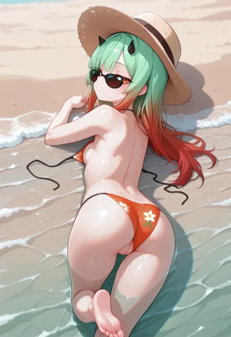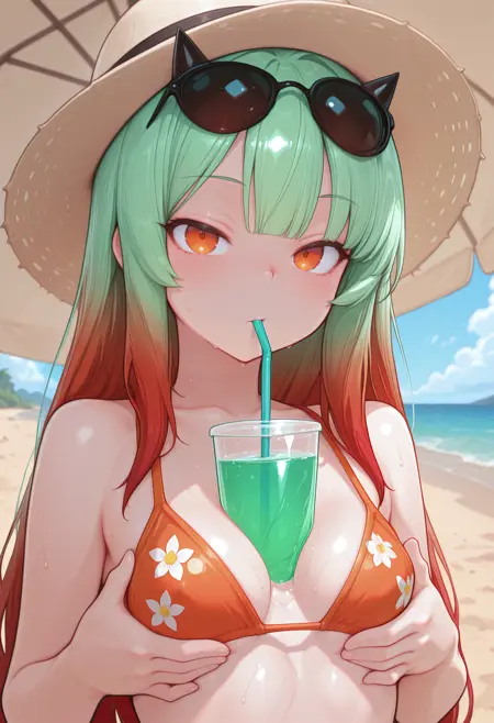 Amber_template, 1girl, バングス, オレンジ色の目, 黒い角, 小さな胸, 長い髪, ヒメカット, 直毛, グラデーション髪, 多色髪, シングル, 緑色の髪, 赤色の髪,