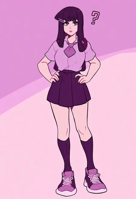 복장:pleated skirt, purple shirt, shoes, purple socks, hairclip, hair ornament, school uniform, short sleeves, kneehighs, collared shirt, sneakers, purple necktie, short necktie, purple skirt, purple footwear
