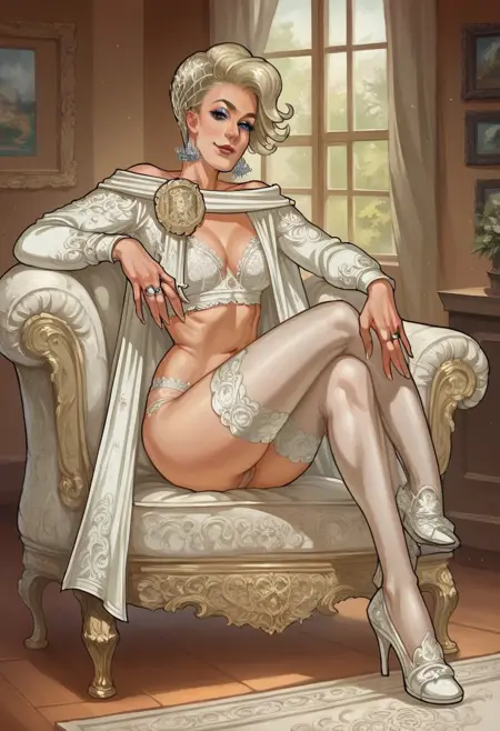 标签为:“C3lia_DE,金色头发,短发,蓝眼睛,口红,眼影”。服装为:“耳环、戒指、白色露肩连衣裙、斗篷、白色高跟鞋。”