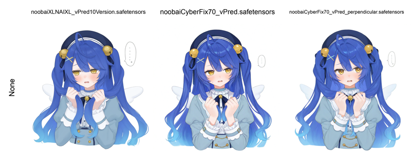从模型合并的逻辑角度来看,标准版 CyberFix 通常更推荐使用,因为它对原模型的影响最小。(然而,不可避免会有一些影响,因为它是 2D/动漫风格模型与 3D/写实风格模型参数的融合。)不过,根据测试结果和示例图像,垂直版有时能获得更好的效果。关于 V 预测模型的使用,请参考原始 NoobAI-XL 模型指南。这里需特别指出,V 预测模型的参数必须严格按照参数指南设置。