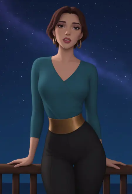 옷: 파란색 V넥 셔츠, 긴 소매, 검은 바지, 금색 띠,