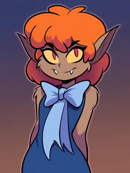 winwil, werewolf girl, orange hair, furry, furry female, animal ears, yellow sclera, red eyes, pointy ears, fangs, dress, body fur, yellow eyes, blue bow, blue dress, sleeveless