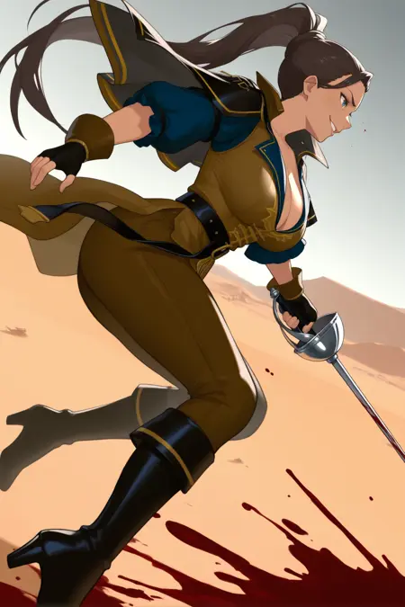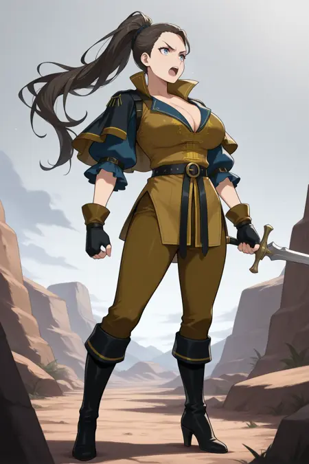그녀의 전형적인 외모를 위해 "검은 캐프렛, 갈색 투닉, 부풀어 오른 짧은 소매, 진한 파란색 소매, 가슴 노출, 손가락 없는 장갑, 검은 장갑, 벨트, 갈색 바지, 하이힐 부츠, 검은 부츠"를 추가하세요.